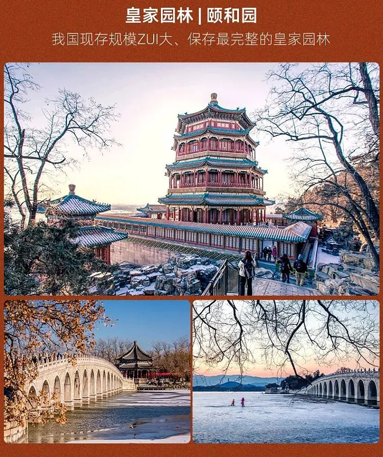 游览世界上最完美的皇家大花园【颐和园】(游览时间约2小时),该园集中国南北园林建筑艺术之大成,拥有世界上最长的画廊和游廊、中国最大的石船和古亭,以及十七孔桥等著名建筑,在昆明湖畔记录下您最美的瞬间。