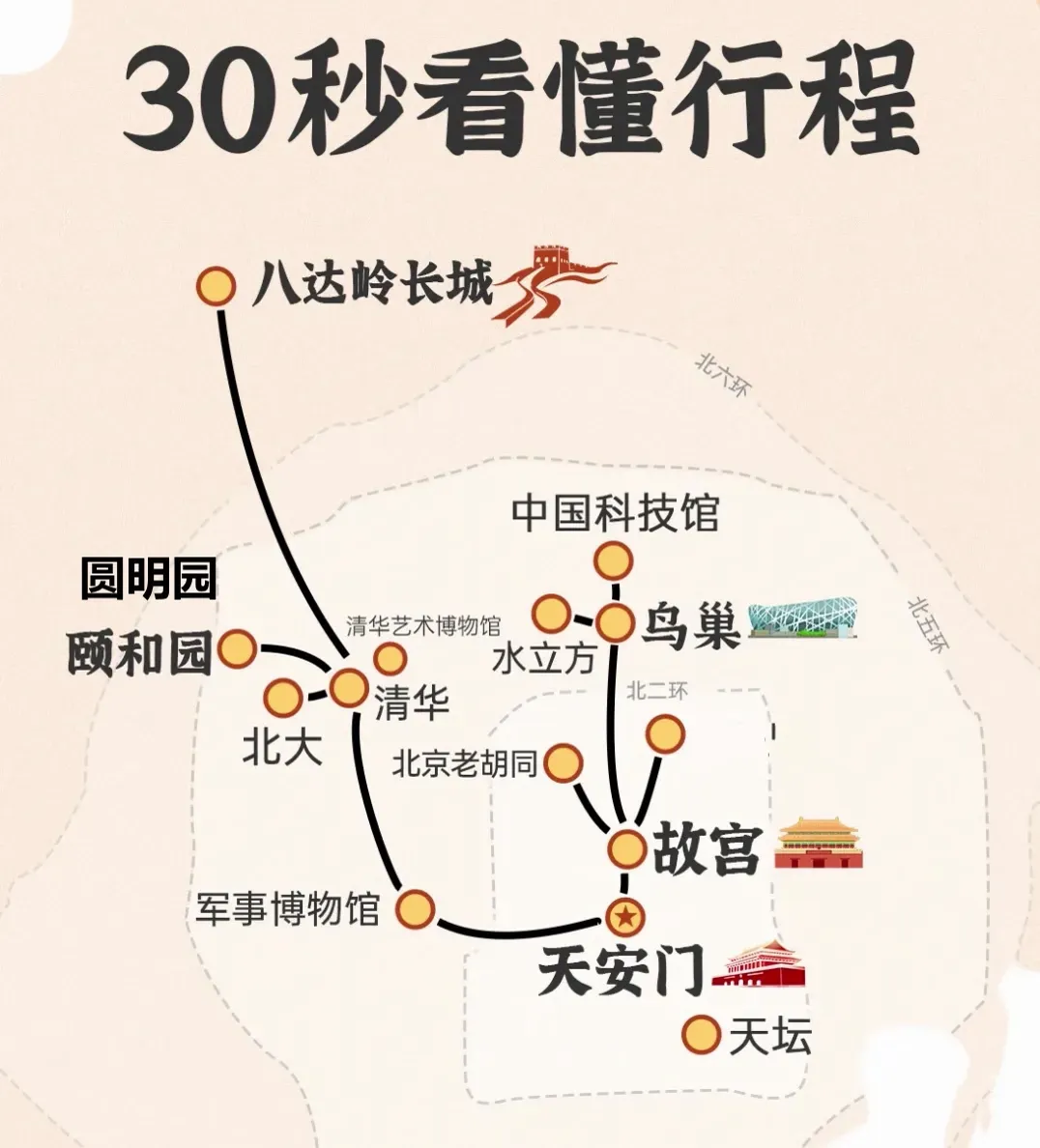 包含景点:故宫、天安门广场、升旗、八达岭长城、鸟巢水立方(外观)、颐和园、天坛、前门,毛主席纪念堂/国家博物馆/首都博物馆/建筑博物馆(4选一)