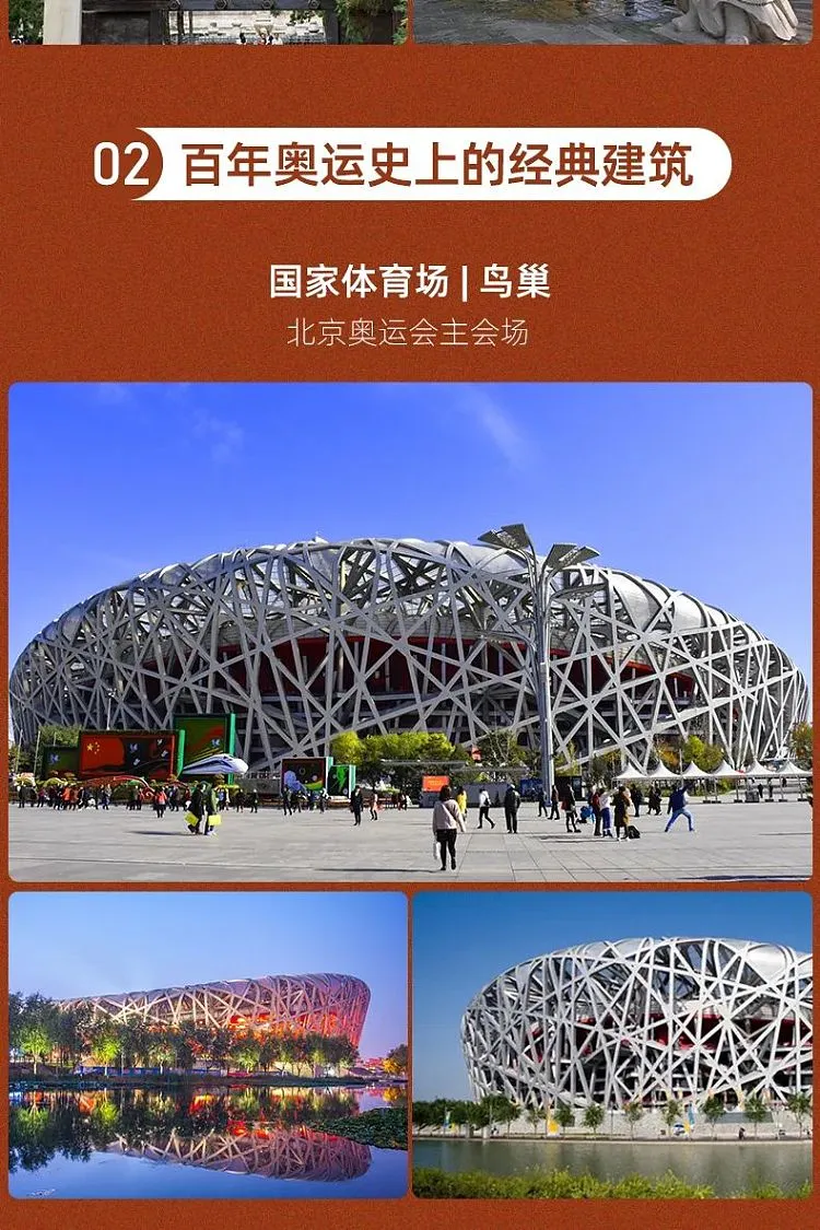 游览【奥林匹克公园】(游览时间约1小时),北京奥林匹克公园,2008 年北京奥运会的举办主场,外观北京新地标【鸟巢】和【水立方】鸟巢形似其名,将中国传统镂空手法、陶瓷纹路、热烈色彩与现代最先进的钢结构设计完美融合在一起。