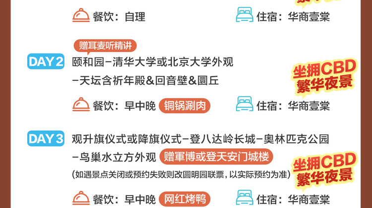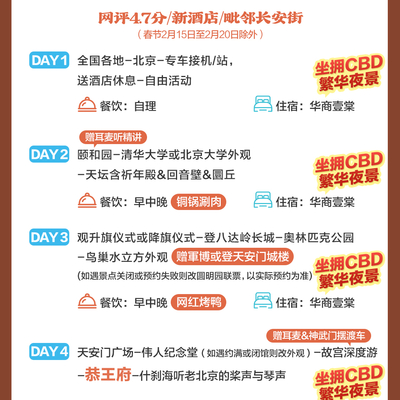 3.由于北京市区交通管控,尤其是2环内核心景区及靠近道路的酒店,均无法短暂停留供游客上下车,同时景区之间亦可能存在无法停车只能步行,因此每天需要步行的距离较多,非司机故意停远,请您谅解。