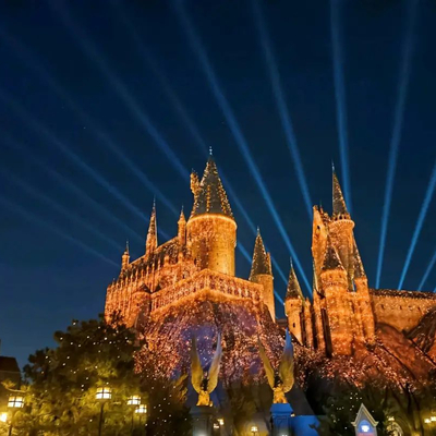 当夜幕降临,投射在霍格沃茨城堡之上的光影将伴随着音乐,为你上演一段关于霍格沃茨四所学院的宏伟篇章,奇幻的色彩、璀璨的光影!