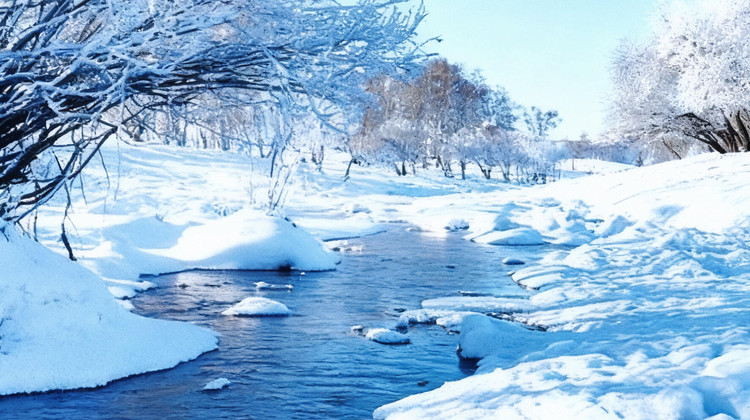 ◆【小河头】流出的水是暖的,太阳光照在雪馒头上,树上的枝头挂满了似冰晶一样的雾凇,在寒风中摇曳,演化绚烂的色彩;~
